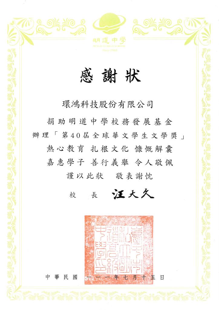 明道中学感谢状–第40届全球华文学生文学奖 (台湾厂)